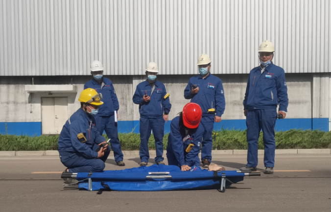 演练模拟因上游酸性气波动,导致硫回收一级转化器床层温度上涨,进而引发制硫区三层发生硫化氢泄漏,现场操作人员在排查过程中遭遇硫化氢中毒倒地,岗位人员立即联系消气防队救援,同时汇报班长后启动现场处置方案进行应急处置,在现场处置过程中,岗位人员向中心经理和调度汇报了现场情况,调度立即申请启动公司级应急预案。